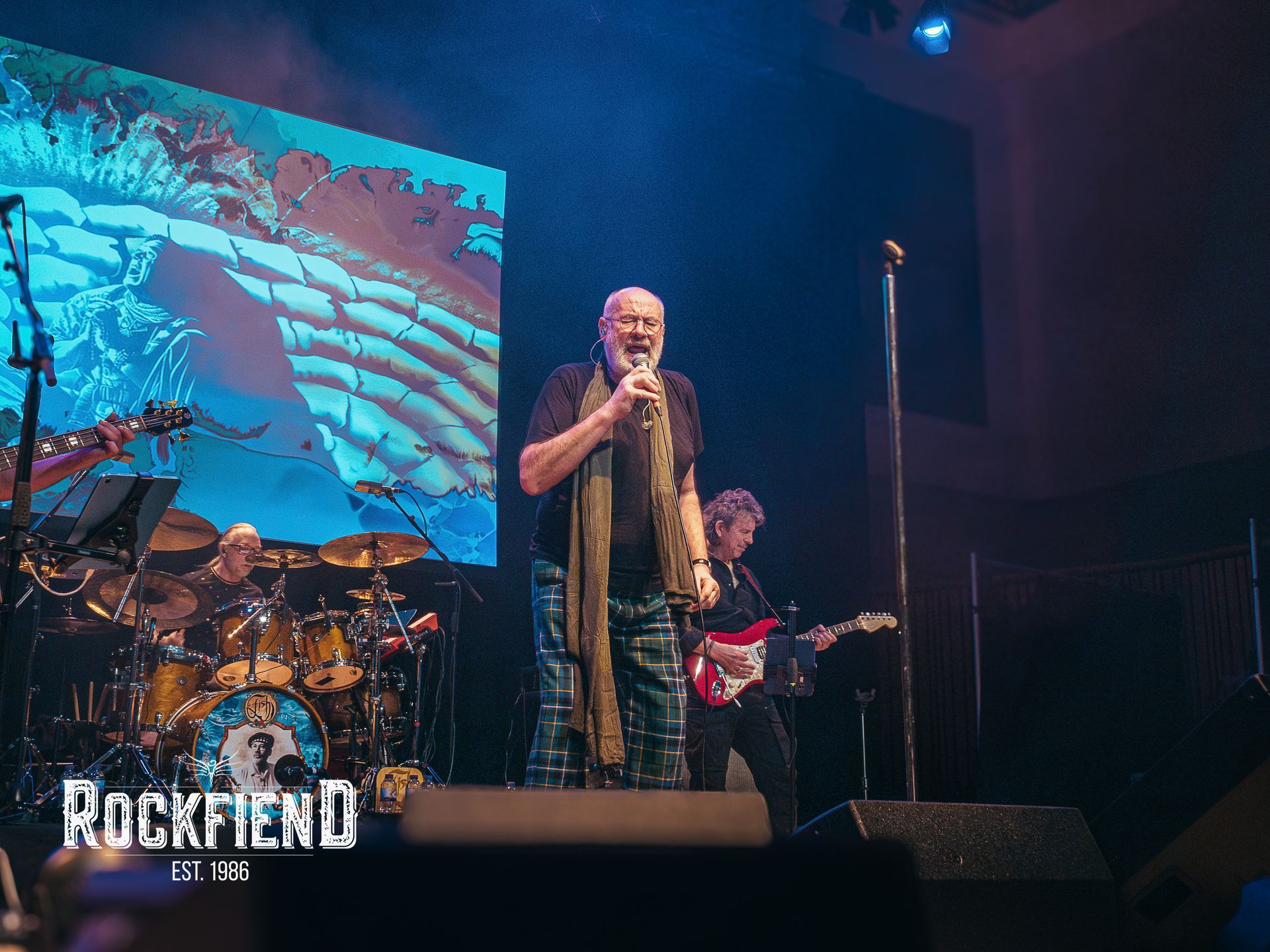 We arrived to the venue pretty sharp, and saw a queue which stretched from the front door of the Music Hall to the tour buses at the back of the building, a length of queue which I have never before had to endure at a concert. I’ve always thought that no one would ever queue like that unless it was to get right to the front of the stage, but it struck me when getting in that only a small majority of fans went to that part of the auditorium with a big number heading for the seats or the bar. Maybe this reflected the older demographic of crowd members at the concert? Fish did joke regularly about how old everyone who came to his concerts had become – he told the crowd he ascertained this from the shine of bald heads in front of him! Fish also said that the only young people at the concert would be the children of Marillion fans. This was certainly true in my case. My dad has been a fan for life, and after years of taking the micky out of him for it, I started to work out both Marillion and some of the Fish stuff was pretty cool. And so, here I am on a cold March evening waiting for the Aberdeen show to begin.