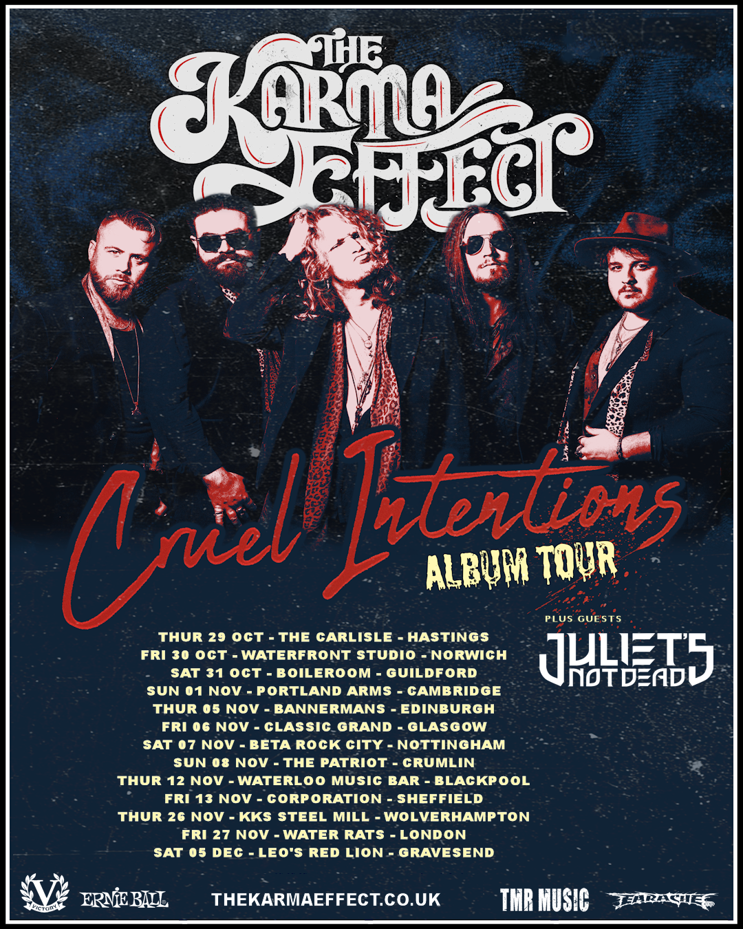 Fast-rising South London rockers The Karma Effect have today confirmed a new 13-date UK headline tour for autumn 2026 in support of their eagerly-awaited forthcoming third album ‘Cruel Intentions,’ which is set for release on 15th May 2026 (via Earache Records). With just a handful of tickets now remaining for the band’s previously-announced album launch show at Tunbridge Wells Forum on 15th May, The Karma Effect are pleased to now announce a full UK headline tour for this autumn, ably supported by special guests Juliet’s Not Dead. Tickets are on-sale here for the band’s autumn 2026 ‘Cruel Intentions Album Tour’ – full list of dates is; THUR 29 OCT - THE CARLISLE - HASTINGS FRI 30 OCT - WATERFRONT STUDIO - NORWICH SAT 31 OCT - BOILEROOM - GUILDFORD SUN 01 NOV - PORTLAND ARMS - CAMBRIDGE THUR 05 NOV - BANNERMANS - EDINBURGH FRI 06 NOV - CLASSIC GRAND - GLASGOW SAT 07 NOV - BETA ROCK CITY - NOTTINGHAM SUN 08 NOV - THE PATRIOT - CRUMLIN THUR 12 NOV - WATERLOO MUSIC BAR - BLACKPOOL FRI 13 NOV - CORPORATION - SHEFFIELD THUR 26 NOV - KKS STEEL MILL - WOLVERHAMPTON FRI 27 NOV - WATER RATS - LONDON SAT 05 DEC - LEO'S RED LION - GRAVESEND TICKETS GO ON SALE AT 11AM TUES 31 MARCH The Karma Effect have also today announced further details of their highly-anticipated third album ‘Cruel Intentions’. The new record is available to pre-order now across a number of CD, vinyl & digital formats, all featuring eleven rollicking new anthems (with a twelfth track, ‘Chasing Sunsets,’ added to the exclusive USB bonus edition format) – tracklisting is; 01 Ride or Die 02 Dangerous Love 03 Lady Bohemian 04 Raised on Rock 'n' Roll 05 Bad Manners 06 Closest Thing to Crazy 07 Waiting on a Miracle 08 Better Luck Next Time 09 Long Gone 10 Cruel Intentions 11 One More for the Road 12 Chasing Sunsets (Bonus track - USB only) WATCH THE VIDEO FOR 'WAITING ON A MIRACLE' VIDEO HERE PRE-SAVE THE ALBUM 'CRUEL INTENTIONS' HERE When The Karma Effect were quietly born in the pandemic, vocalist Henry Gottelier and guitarist Robbie Blake could hear in their heads how they wanted the project to sound. From their organic, rootsy, eponymously-titled 2022 debut, followed by 2024’s show-stopping surprise Top 20 album ‘Promised Land’, they now truly arrive with their third record, striding confidently into their role as one of British guitar music’s most exciting outfits. Although some line-up changes occurred in the background (which saw Nathan Keevil join them on bass, Alan Taylor on drums, and Tom Pitt on keys), a turn of events that could have left them on shaky ground has instead been spun into a silver lining. Brimming with energy and fresh perspectives, the newly assembled line-up convened at The Hive Rooms, in the locale of Gatwick Airport, to nail down what would become ‘Cruel Intentions’ in July 2025. The new album is a collection which captures the visceral atmosphere of the band’s lauded live performances and is without a doubt the most complete, crystal clear realisation of the band’s ambitions yet: leaner, louder, heavier and joyously larger-than-life. Exploring notions of love, lust and danger, with dark passion and flashes of cheekiness, The Karma Effect’s new songs maintain a fine balance of swagger and wit, further advancing the band’s ‘modern vintage’ ethic - polishing up the retro sounds they were raised on into something gleaming and modern. Take the swaggering recent single ‘Dangerous Love’ – “It’s about doing things you shouldn’t do, but you can’t stop yourself: passion overtaking your senses and your mind getting away from you,” explains Henry. Barnstorming opener ‘Ride Or Die’ is a weighty statement of intent, an early display of Gottelier’s classic ‘70s Stones meets 80’s Fairbairn-era Aerosmith songwriting chops, whilst the album’s title track ‘Cruel Intentions’, meanwhile, is about a stalker. It’s not entirely steeped in darkness, however – sometimes, there are flashes of cheekiness. ‘Better Luck Next Time’, for example, is a tongue-in-cheek meditation on feeling the sharp end of sod’s law, following someone’s day as it spirals into the stuff of farce. "This album is the culmination of everything we have." says singer Henry Gottelier. "While collaborating again with producer Michael Charman, we brought in Mercury and GRAMMY nominated Romesh Dodangoda specifically for the mix, because we were obsessed with making every single note count. The result is a sound so big, it’s a stadium experience for your ears" ‘Cruel Intentions’ is available to pre-order here on signed editions, limited alt artwork editions, limited coloured vinyl and more.