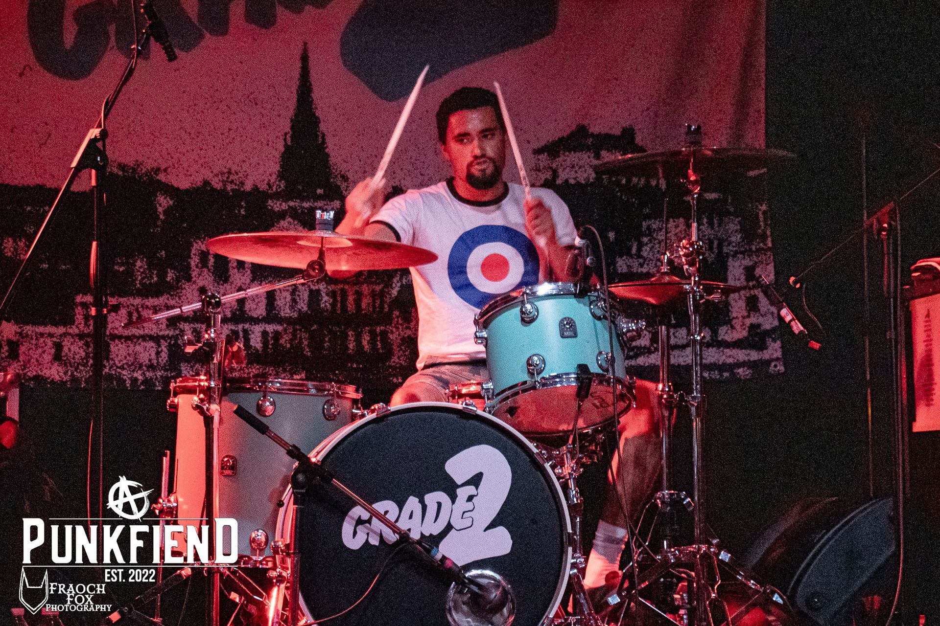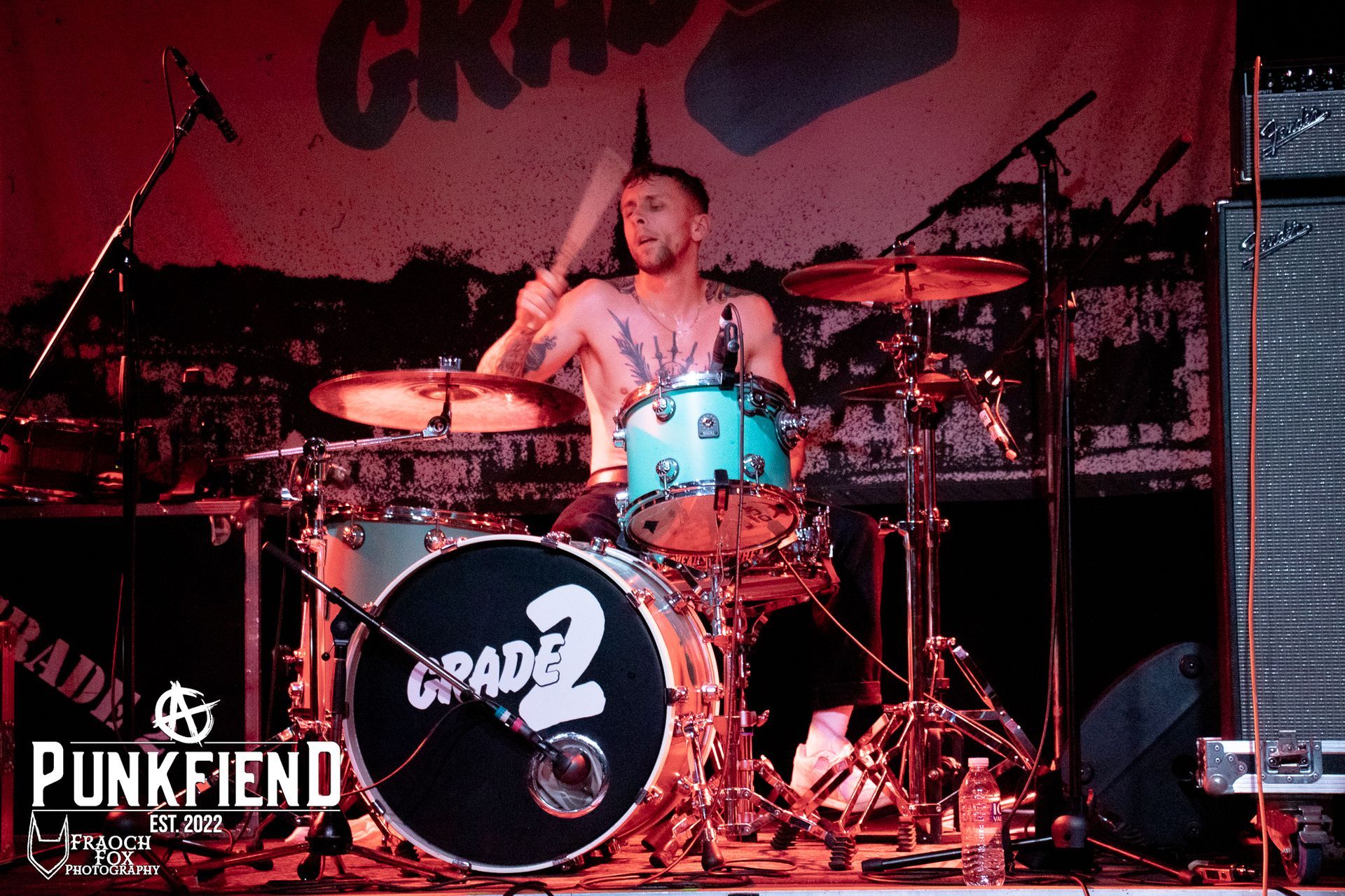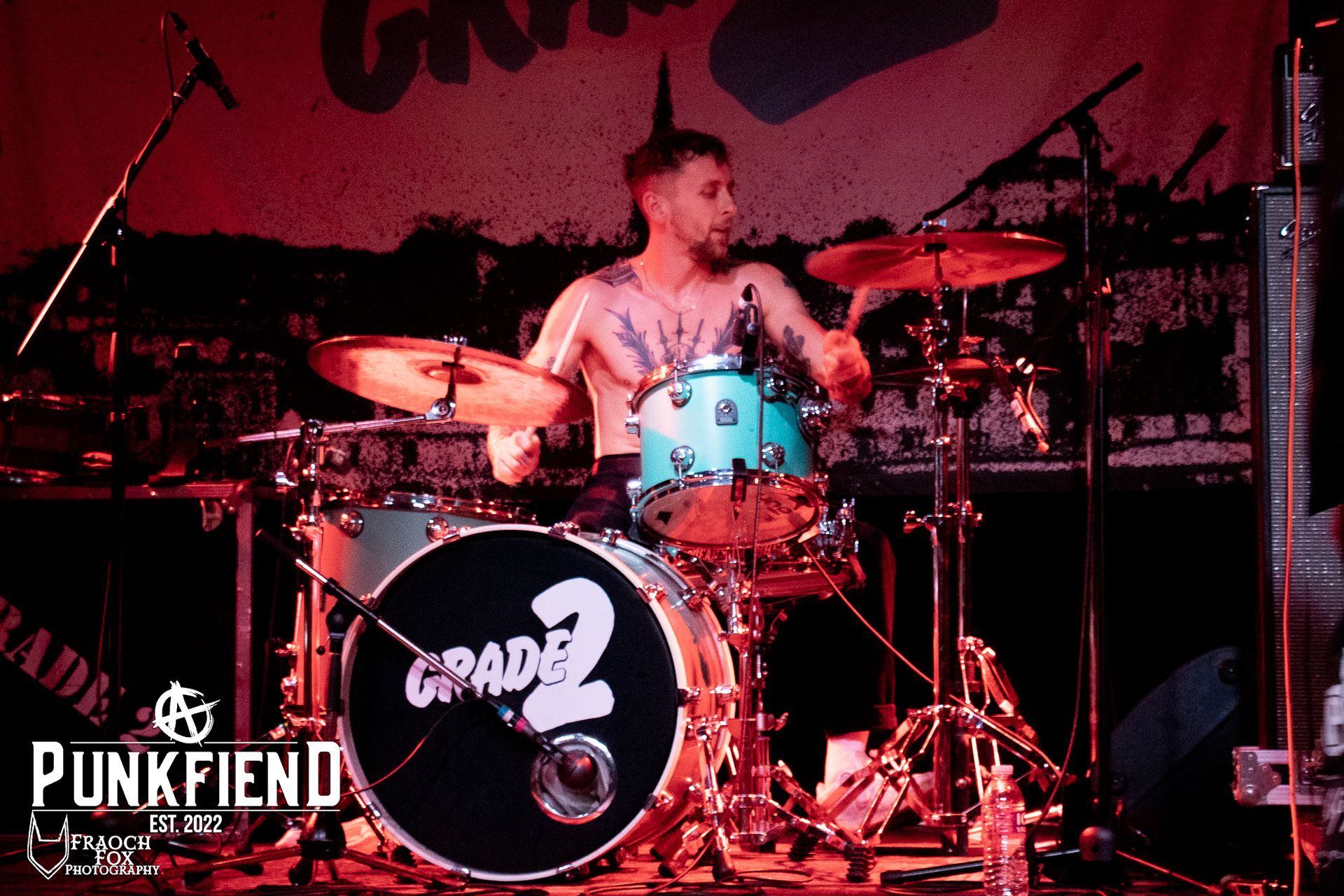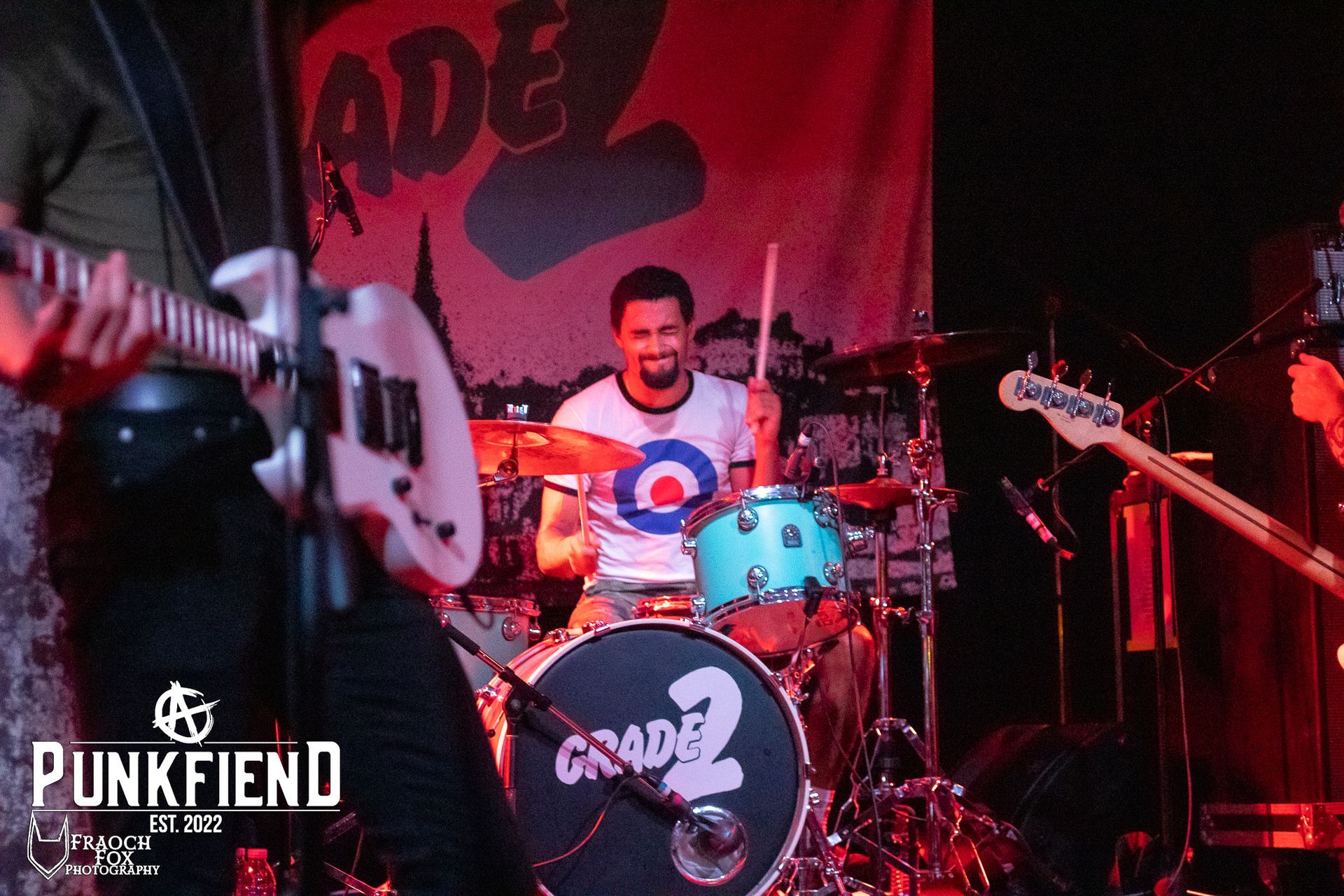 The main event comes quickly, there is not too much time between acts tonight which I really like, the momentum is continuous, it suits the mood and the music. Headliners Grade 2 to explode on the stage, I noticed bassist/vocalist Sid had been poised waiting at the side and had wondered was the ritual/nerves or was he just raring to go? Their roar to life with ‘Graveyard Island’ screams the obvious, he was ready for this. They are full of glee as they confidently tear into their set. Sid and guitarist/vocalist Jack seamlessly switching position, eyes meeting the crowd exuding total joy and clearly demonstrating their decade of experience playing together long before Sid thanks the crowd for taking part in this moment for them. It is well documented bands love the crowds and despite it being a Monday those who have turned up really have. It is not fully riotous but then neither are Grade 2, they are slick and polished, not sanitised but a well-oiled unit. For those who wish there is some merry jousting at the barrier and if not lots of toe taping and righteous head nodding just a little back. Drummer Jacob seems almost in a zen like state furiously crashes with precision through most of the set with his eyes closed, the whole band are in the zone. They speak of the privilege it is to spend ten years doing what the love with a genuineness that energies the crowd further, leading in to ‘Only Ones I Trust’ followed by ‘Under The Street Lights’ ending on a high. They are exactly what I had expected while listening to their latest record, a band you should really see live and a reminder that music can unite and help us deal with the frustrations of an ever increasingly exasperating world.