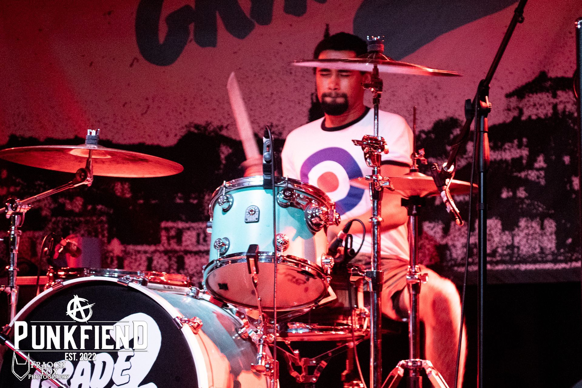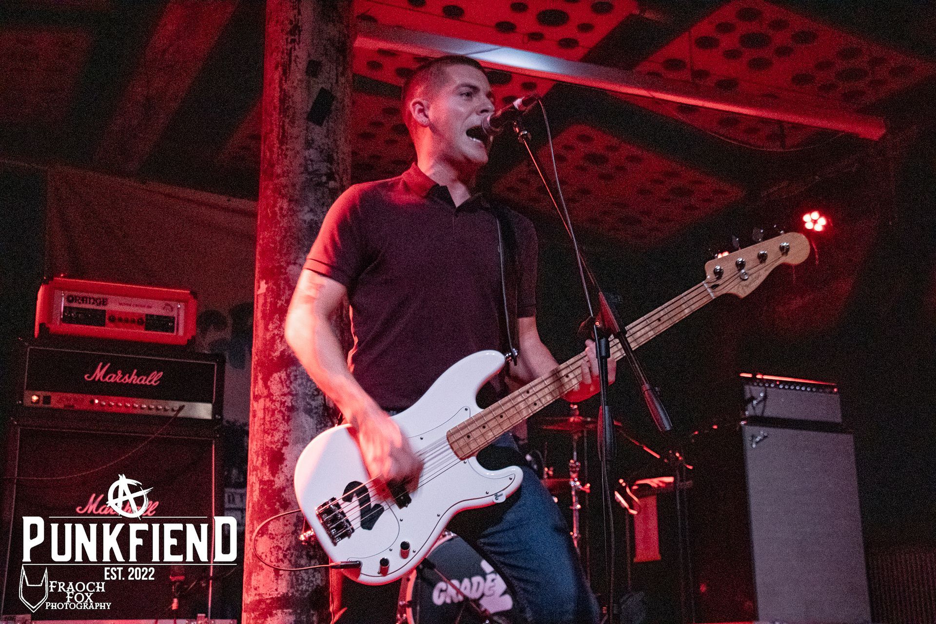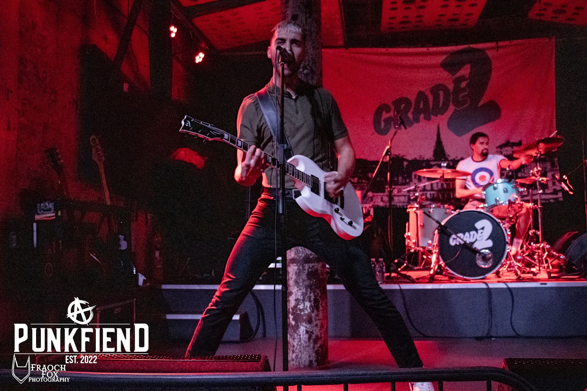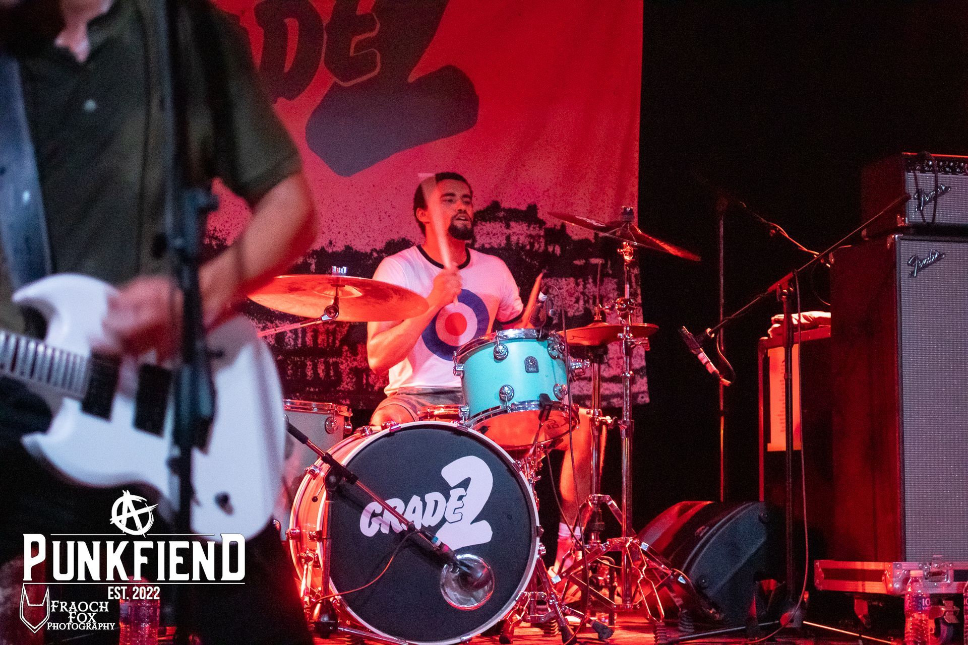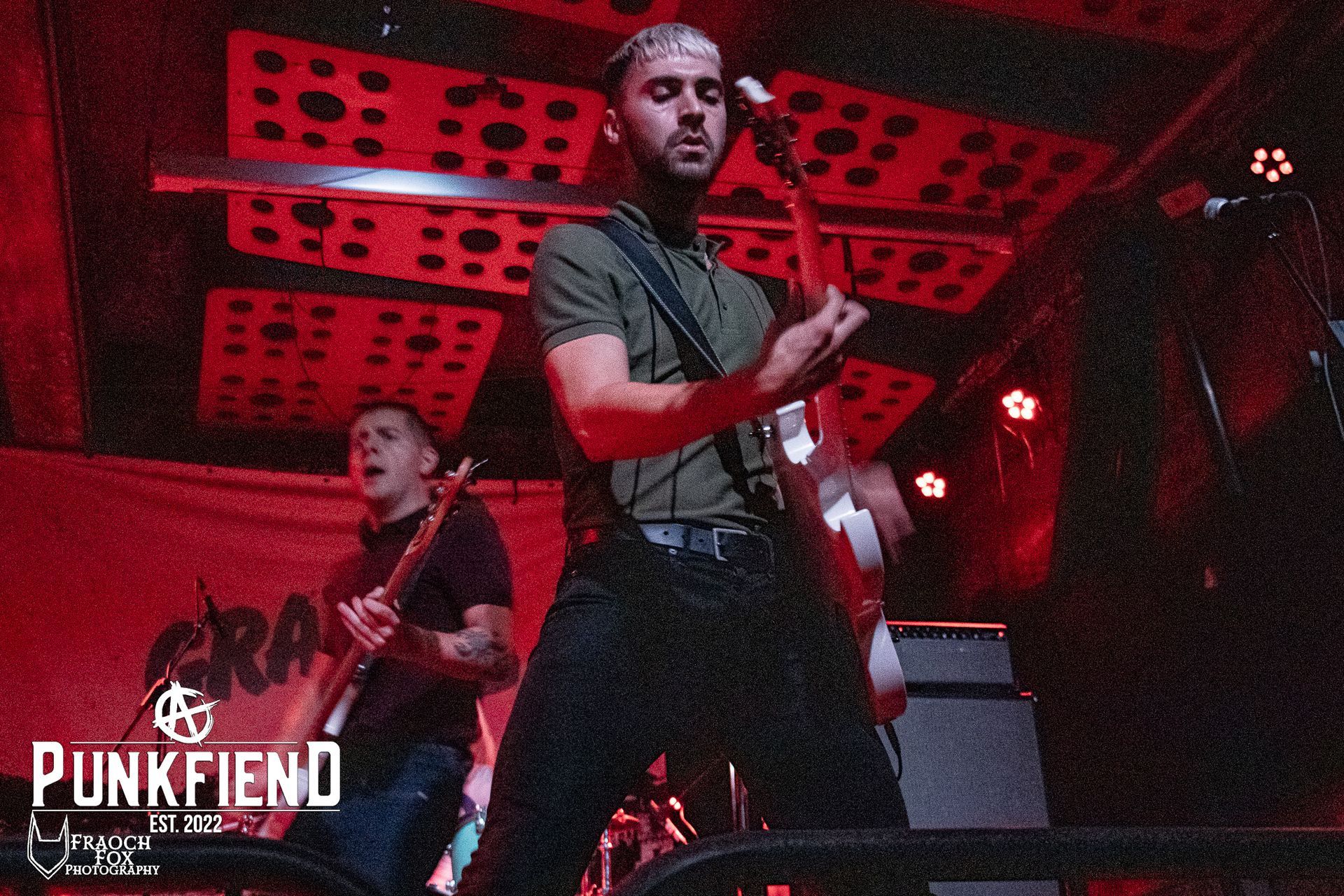 The main event comes quickly, there is not too much time between acts tonight which I really like, the momentum is continuous, it suits the mood and the music. Headliners Grade 2 to explode on the stage, I noticed bassist/vocalist Sid had been poised waiting at the side and had wondered was the ritual/nerves or was he just raring to go? Their roar to life with ‘Graveyard Island’ screams the obvious, he was ready for this. They are full of glee as they confidently tear into their set. Sid and guitarist/vocalist Jack seamlessly switching position, eyes meeting the crowd exuding total joy and clearly demonstrating their decade of experience playing together long before Sid thanks the crowd for taking part in this moment for them. It is well documented bands love the crowds and despite it being a Monday those who have turned up really have. It is not fully riotous but then neither are Grade 2, they are slick and polished, not sanitised but a well-oiled unit. For those who wish there is some merry jousting at the barrier and if not lots of toe taping and righteous head nodding just a little back. Drummer Jacob seems almost in a zen like state furiously crashes with precision through most of the set with his eyes closed, the whole band are in the zone. They speak of the privilege it is to spend ten years doing what the love with a genuineness that energies the crowd further, leading in to ‘Only Ones I Trust’ followed by ‘Under The Street Lights’ ending on a high. They are exactly what I had expected while listening to their latest record, a band you should really see live and a reminder that music can unite and help us deal with the frustrations of an ever increasingly exasperating world.