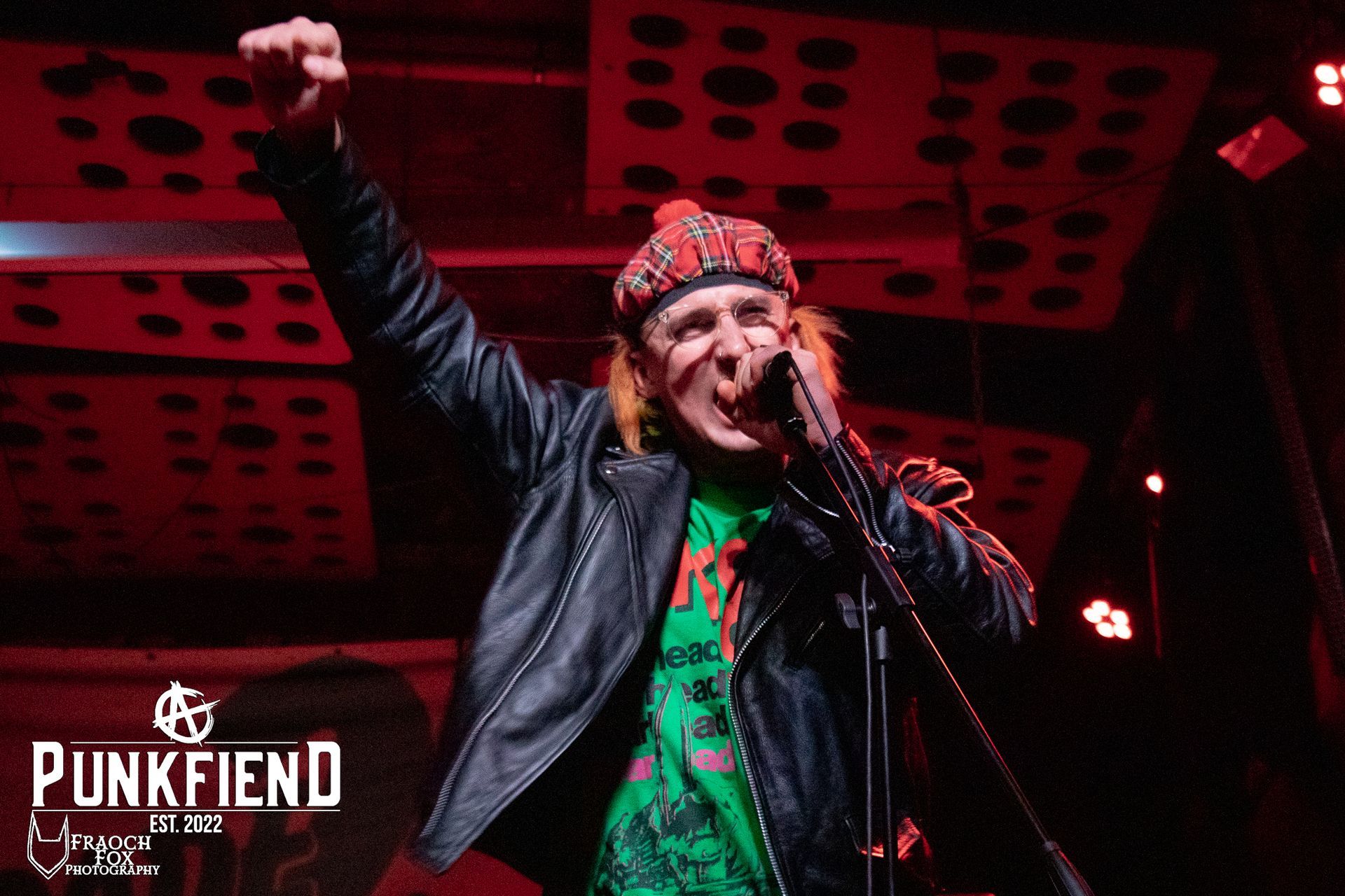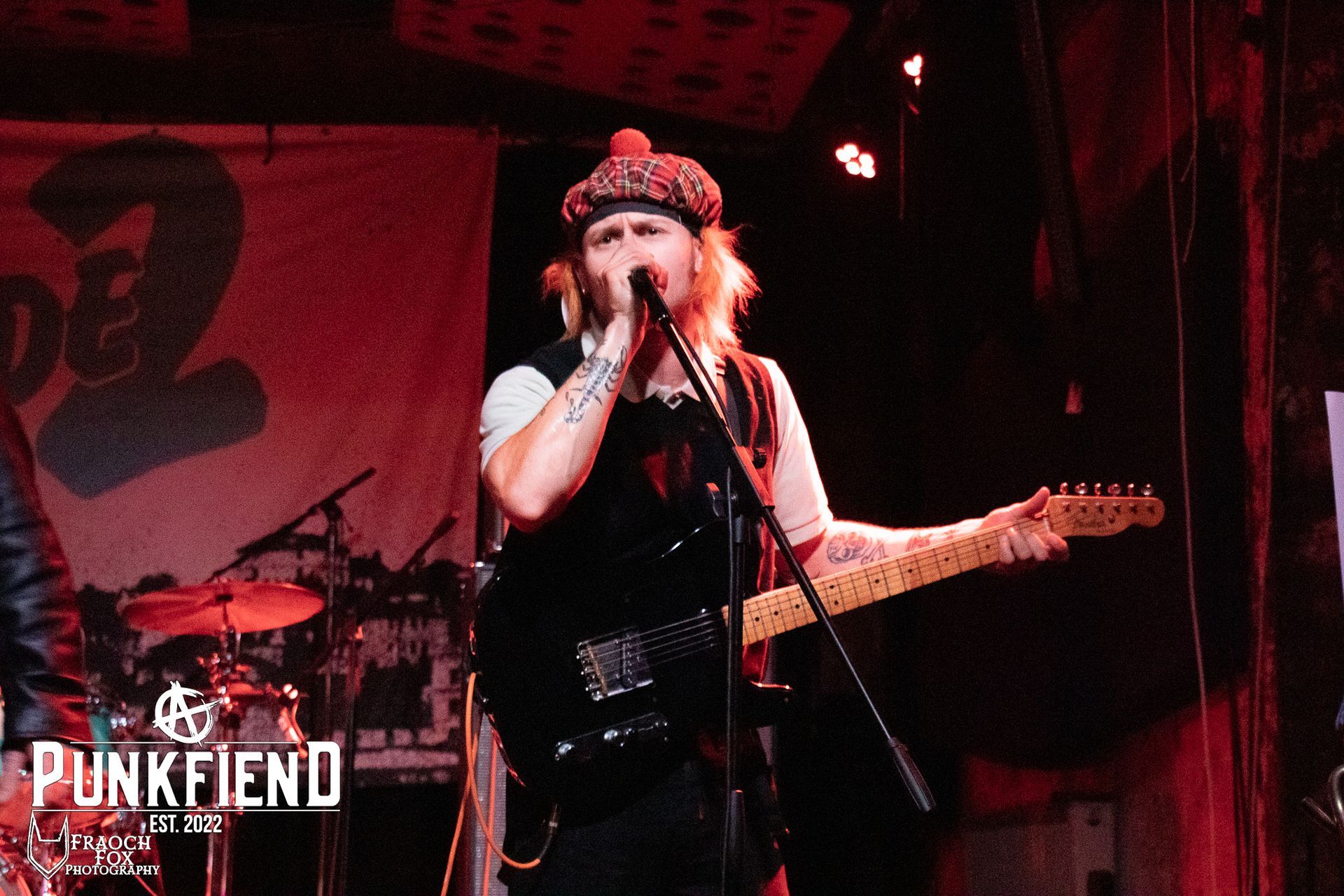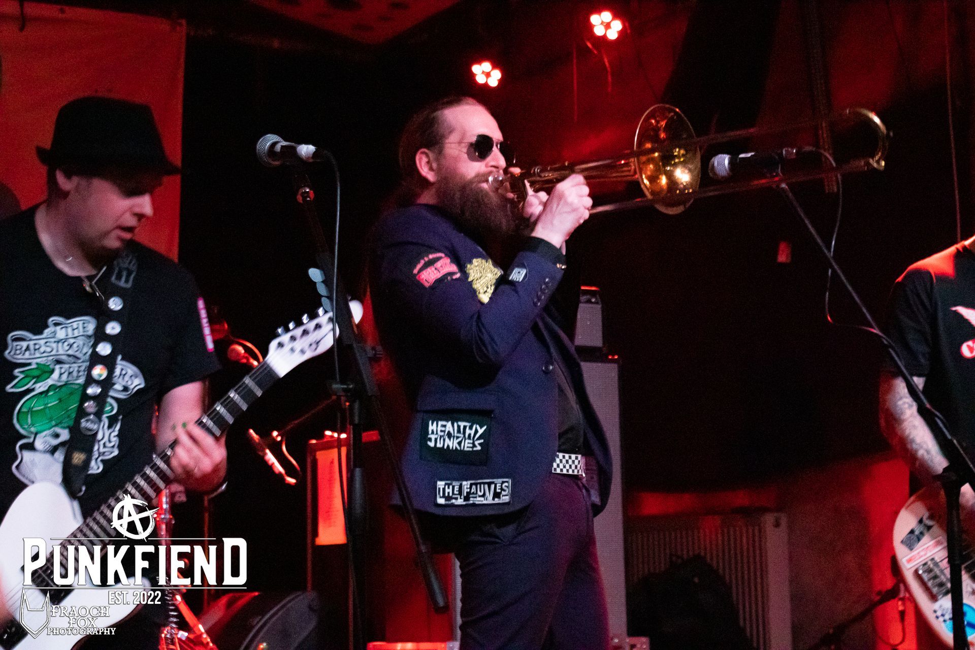 First on the bill are Glasgow based five-piece The Guillotines consisting of: Micah – vocals/lead guitar, Steve Oi! -vocals/bass, John vocals/guitar, Davie Snakes – vocals/trumpet/trombone and Andy – vocals/drums. Despite taking the stage shortly after doors opening there is a substantial crowd considering it’s a Monday, perhaps showing their home team advantage, but any thoughts that locality is their draw is immediately dispelled as the they punch nosily into the room with amazing energy, setting the tone of an excellent evening. They’re set is tight, it’s clear they are seasoned musicians, who are not just comfortable, they are in command. The Guillotines breathe life into the crowd, bodies moving and shouting back enthusiastically to their interaction. This fast-paced Punk Ska is exactly what we all came here for. 'Bojo The Clown’ clearly a favourite with the crowd poking fun and a finger at our former prime minister, a comical if grim reminder of the world out with and of Punks place in it.